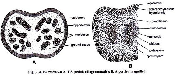 Embedded in the ground tissue are haphazardly embedded leaf traces or vascular strands or meristeles. The number of leaf traces varies within the size and age of the leaf. The larger petioles have several haphazardly arranged vascular strands while smaller petioles have vascular strands arranged in the shape of a much convoluted horse-shoe open towards the upper side of the petiole. The structure of vascular strands resembles with that of meristeles of rhizome.