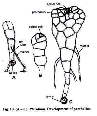 There is no development in the other cells of the filament. The apical cell cuts off segments on its right and left alternately and ultimately forms a green, multicellular one celled thick young prothallus. The apical cell soon gives rise to many marginal initials which help in further growth of gametophyte.