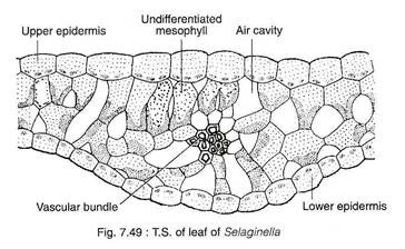 A T.S. of a leaf shows two epidermal layers, mesophyll tissue, stele and stomata (Fig. 7.49). The cells of upper and lower epidermal layers may be similar in most of the species (e.g., 5. rupestris). However, they may be somewhat different in some species (e.g., 5. martensii) where the upper epidermis consists of conical cells, but the cells of the lower epidermis are smaller.