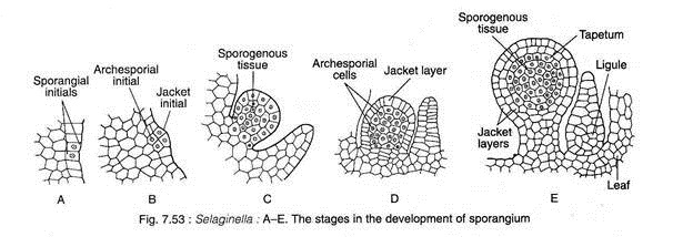 Initially the development of micro- and megasporangia are similar. The sporangial development is of eusporangiate type i.e., the sporangium develops from a group of initial cells (Fig. 7.53A-E).