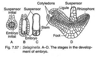After fertilisation, the diploid sporophytic generation (i.e. zygote) is established. The first division of the zygote is generally transverse (Fig. 7.57A). The upper cell (epibasal) develops into one- or several-celled suspensor (that are toward the archegonial neck) and the lower cell (hypobasal) to the embryonic cell. The embryo is endoscopic (embryonic cell directed toward the base of the archegonium) in nature.
