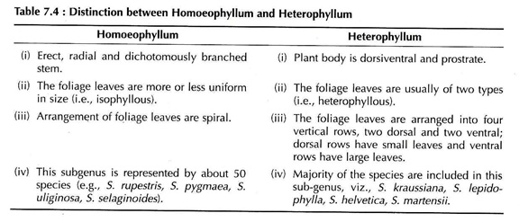 Hieronymus (1902) divided the genus Selaginella into two sub-genera viz., Homoeophyllum and Heterophyllum on the basis of general structure of the plant body (Table 7.4).